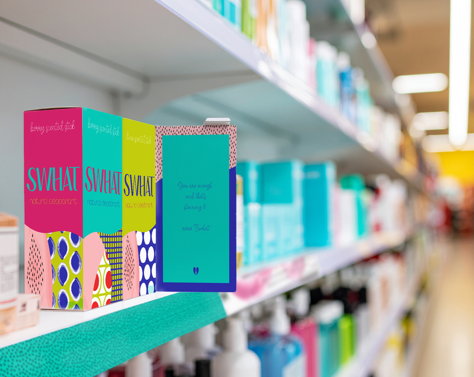 The design language captures the brand’s empowering spirit, encouraging unapologetic individuality. Bold, mix-and-match patterns express SWHAT’s joyful essence while ensuring strong visibility and recognition across digital, print and physical touchpoints.